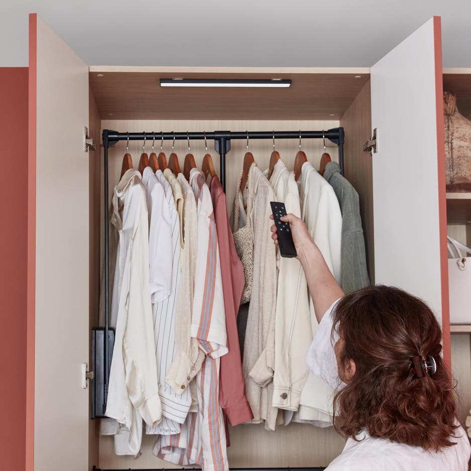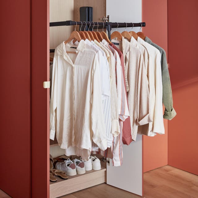 Comme la dernière barre de penderie est en hauteur, elle bascule pour qu’on puisse prendre les cintres plus facilement.