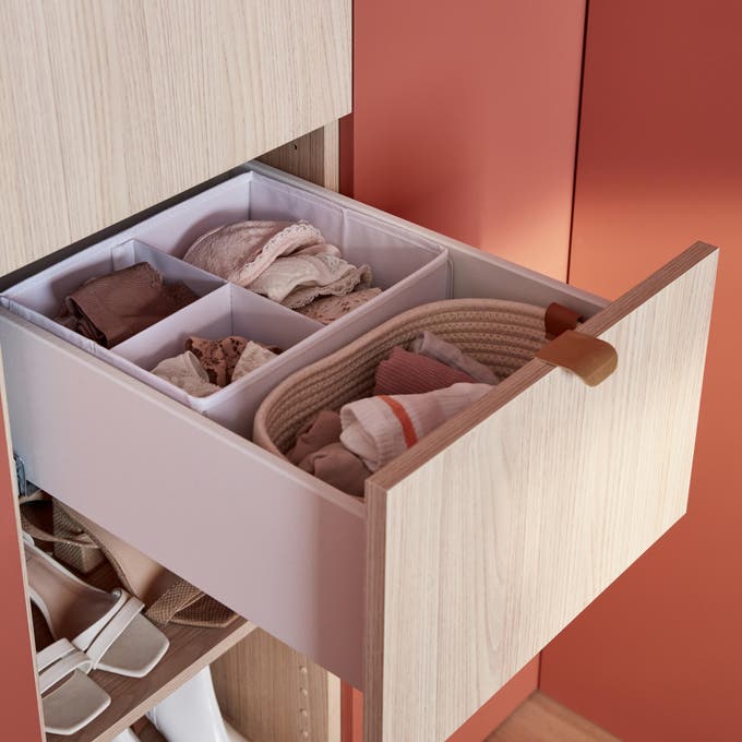 Le module ouvert mixe objets de déco et jolies pièces de mode : quelques beaux sacs en haut et les paires de chaussures du moment en bas. Dans les tiroirs effet bois, la lingerie est bien organisée.