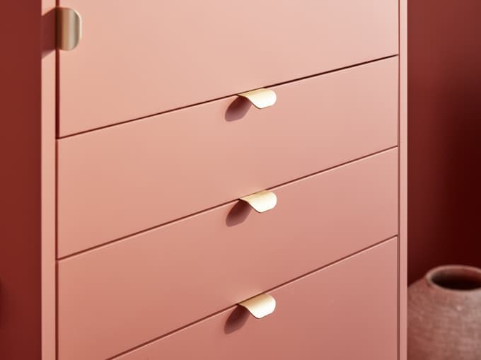 Cela passe par l’alternance de modules fermés et de modules ouverts, l’organisation sur mesure des espaces en fonction des pièces à ranger, et surtout des détails raffinés comme les façades sans poignées et les tiroirs avec leurs poignées dorées délicates.