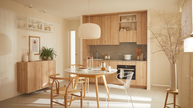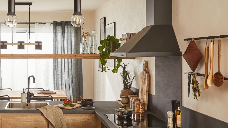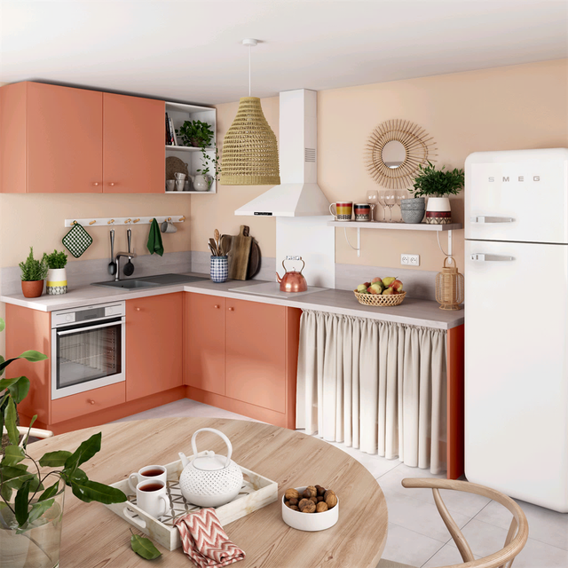 Pour une cuisine bohème, on mise sur les couleurs chaudes, le terracotta en tête, et les matières naturelles comme le bois et les fibres végétales pour le plan de travail, les luminaires et les accessoires.