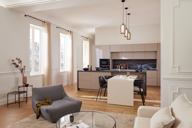 Quand la cuisine est ouverte, l’enjeu est bien sûr de trouver une harmonie entre les couleurs du salon et les couleurs de la cuisine.