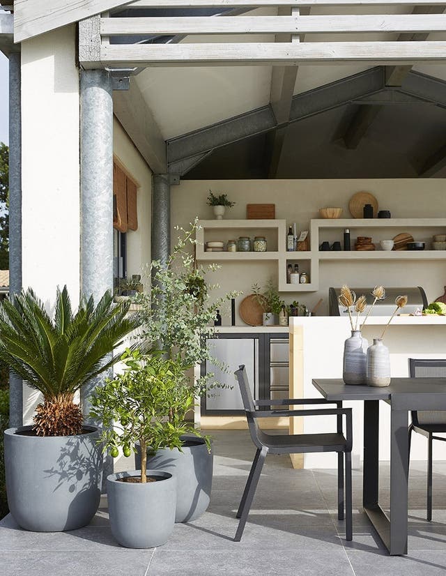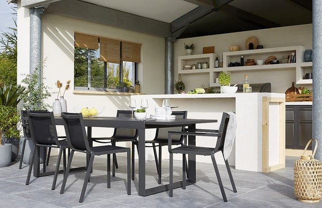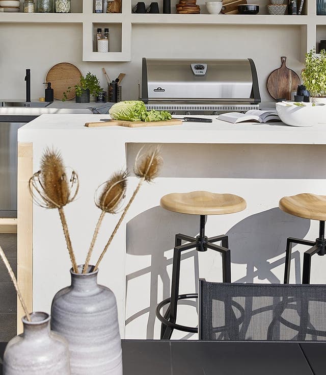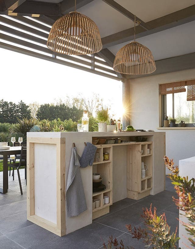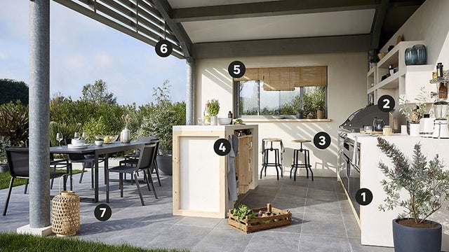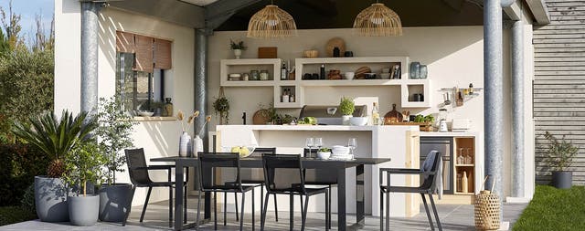 Quel plaisir de disposer d’une vraie cuisine d’extérieur, bien équipée et spacieuse. En l’aménageant sous un grand avant-toit, on peut l’utiliser plusieurs mois de l’année et cuisiner même en cas d’averse. L’implantation idéale ? Deux linéaires se faisant face. Adossé au mur, un grand linéaire fonctionnel, intégrant cuisson, lavage et stockage et, au centre, un bar autour duquel on peut circuler ou s’asseoir. Faisant la jonction entre cuisine et coin repas, le bar sert également de plan de travail et de passe-plat. Côté style, on le préfère chic et contemporain, en accord avec les caissons de cuisine en acier inoxydable. Et pour la touche chaleureuse, on ajoute des touches de bois et de matières naturelles.