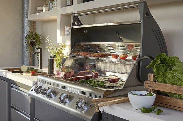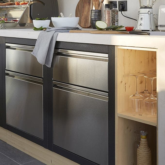 Pièce maîtresse du linéaire, le module cuisson : on opte pour un modèle de barbecue familial de 85cm de long (pour 8 personnes), et qui a l’avantage de pouvoir être utilisé comme grill, plancha et four (en position fermée).