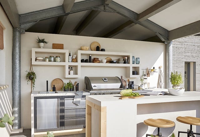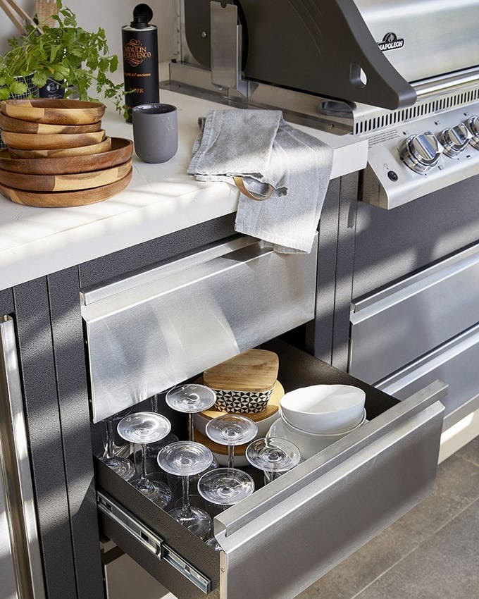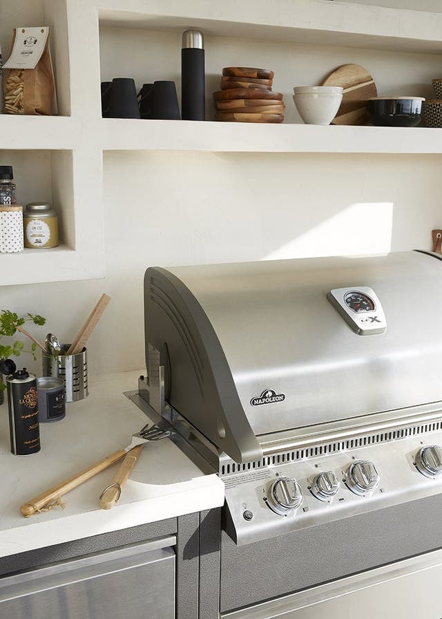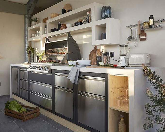 Adossé au mur du fond, on prévoit un linéaire fonctionnel et complet composé de modules de cuisine d'extérieur en acier inoxydable, aussi pratiques que design.