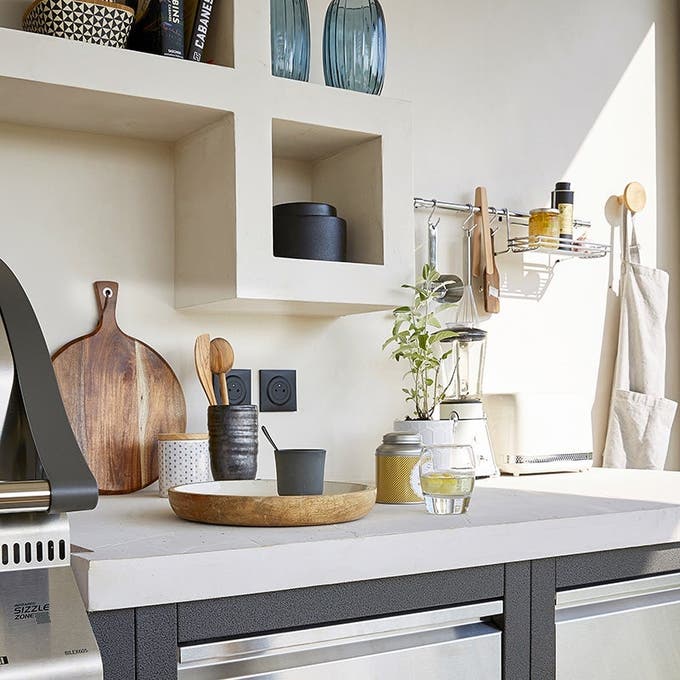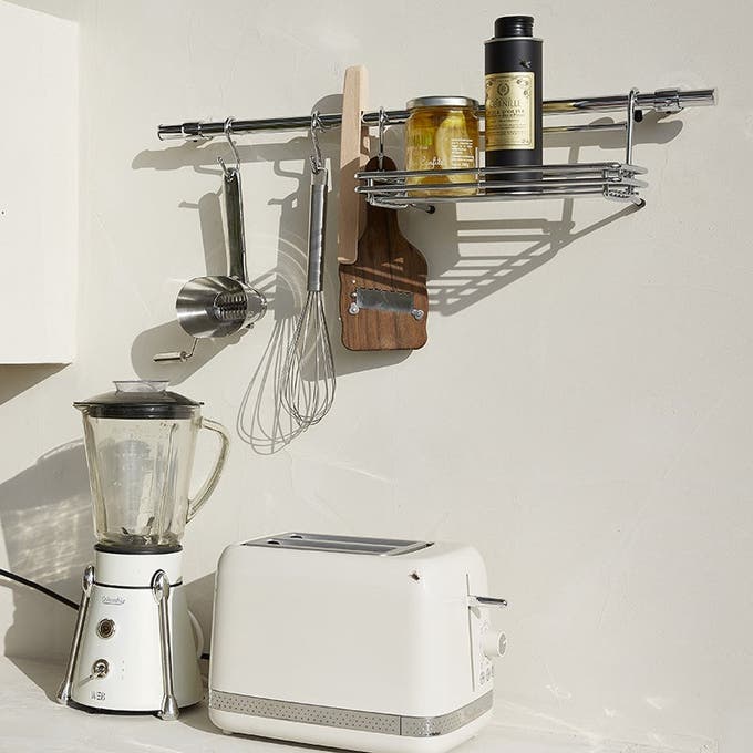 Bien intégrée au mur de la même teinte, l’étagère est moins longue que le linéaire, ce qui permet de la compléter par une barre de crédence en métal, pratique pour suspendre les ustensiles courants.