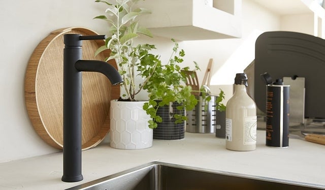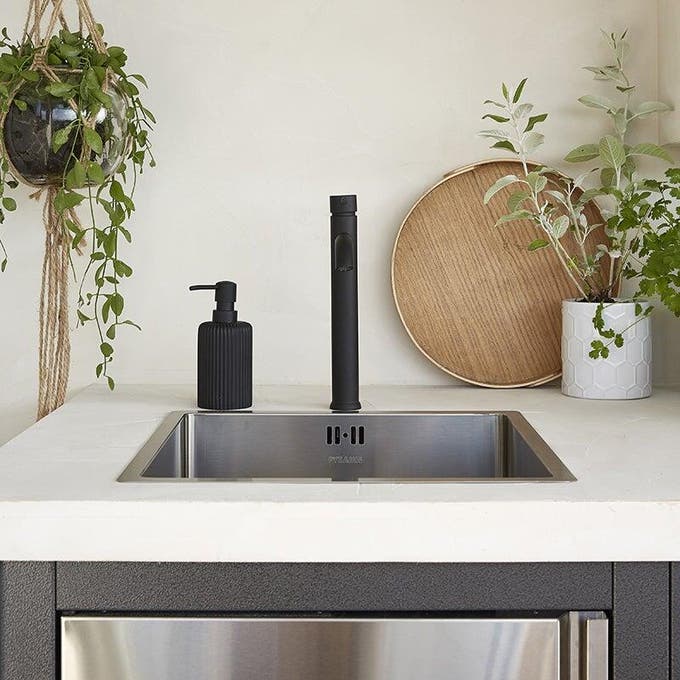 Évier et robinet suivent le mouvement : cuve carrée en Inox et robinet noir au profil épuré, gage d’élégance.