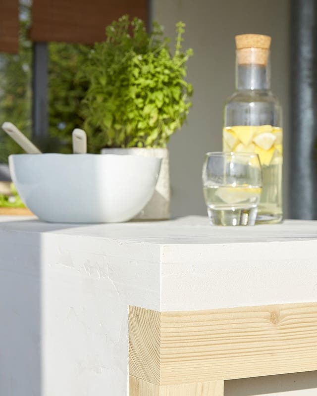 Pour le plan de travail et les joues, on utilise des carreaux de béton cellulaire, adaptés à une utilisation en extérieur.