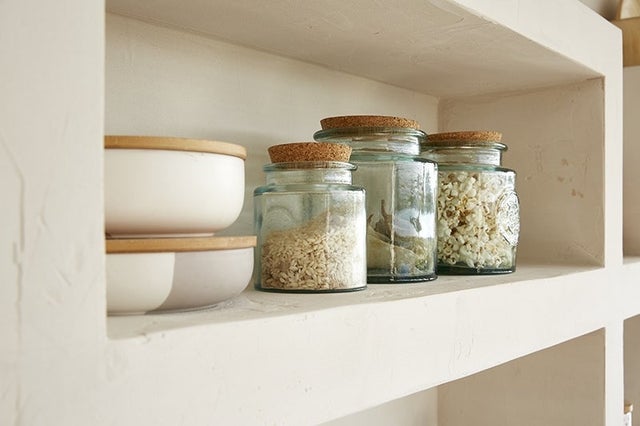 On fait le lien avec le jardin en ajoutant quelques touches de matières naturelles que l’on dissémine dans tout le volume : plateau en osier, fleurs séchées, pots en verre et couvercles en liège, etc.