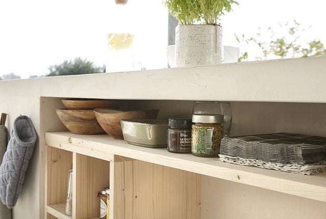 Un module de rangement DIY en tablettes de pi vient compléter l’aménagement : pratique pour avoir la petite vaisselle à portée de main.