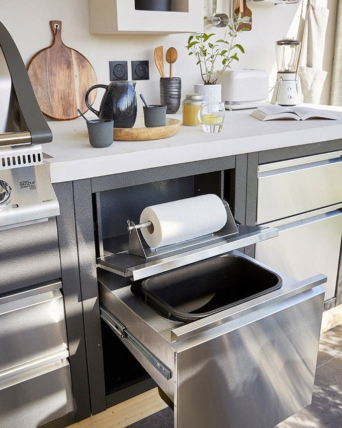 On varie les modèles de caisson de cuisine. Ainsi, on dispose de modules de rangements adaptés : tiroirs de différentes hauteurs, module poubelle, dévidoir à essuie-tout, etc.