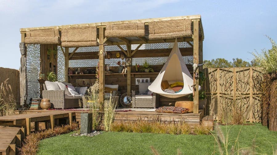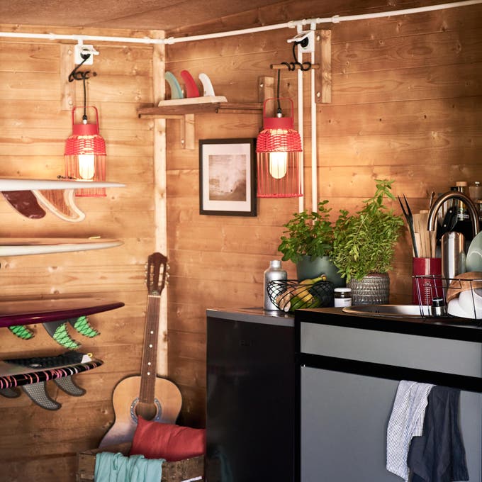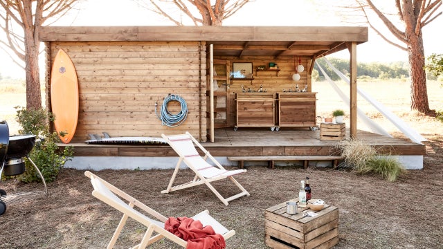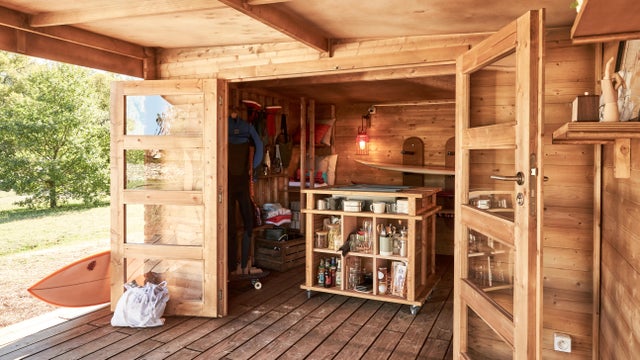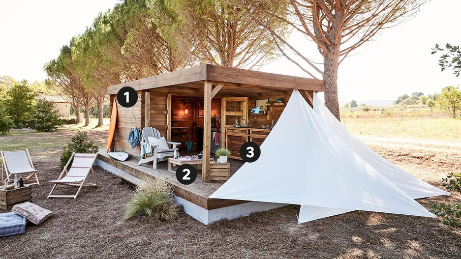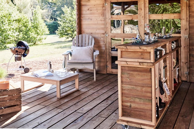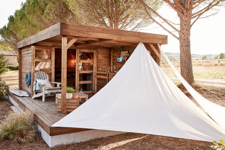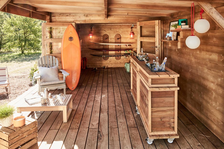 Si vous aimez passer du temps à l’extérieur, cet abri de jardin est fait pour vous ! Avec quelques aménagements astucieux et du mobilier bien choisi, il va devenir le spot incontournable pour recevoir les amis tout en offrant un espace de rangement aussi ingénieux que discret. Doté d’une partie fermée et d’un grand auvent, sa configuration est idéale pour installer un salon d’extérieur, protégé du soleil et du vent par des grandes voiles d’ombrage. Un double bar DIY mobile et des éclairages solaires participent à l’ambiance décontractée et festive. Les parois de la partie intérieure sont équipées de rangements sur mesure qui optimisent tout le volume, complétés par une mini-cuisine avec frigo et évier. Il ne vous reste plus qu’à envoyer les invitations pour le prochain barbecue ! Découvrez comment vous inspirer de cet aménagement.