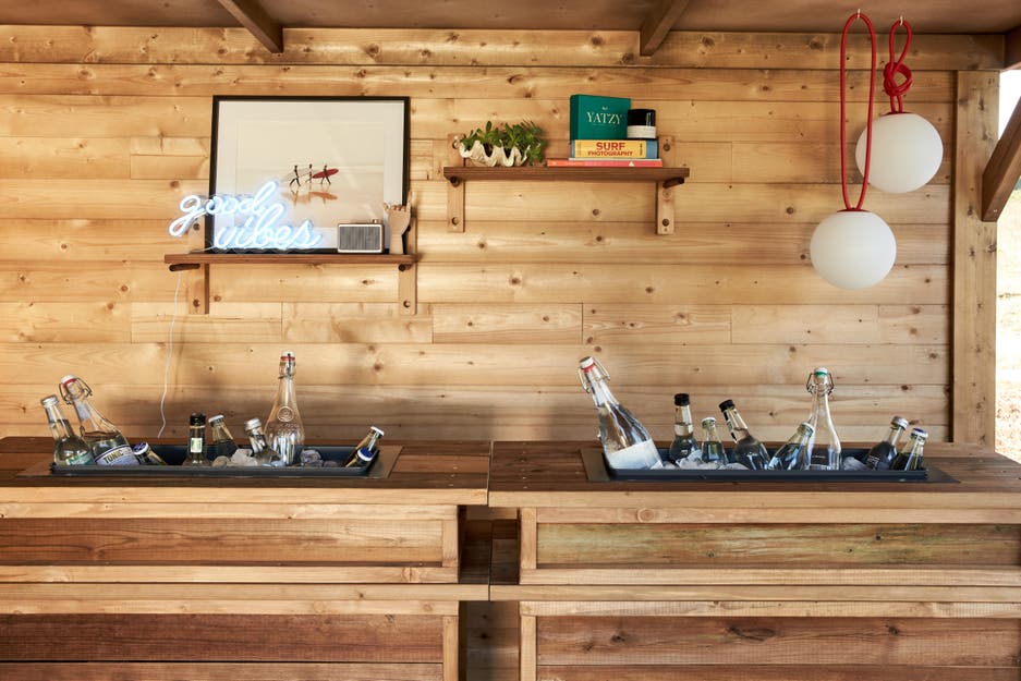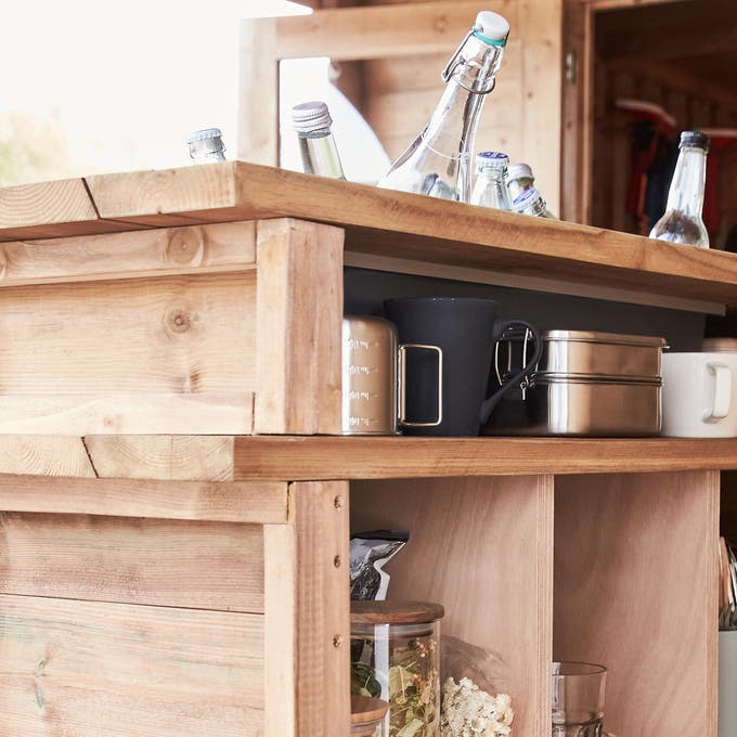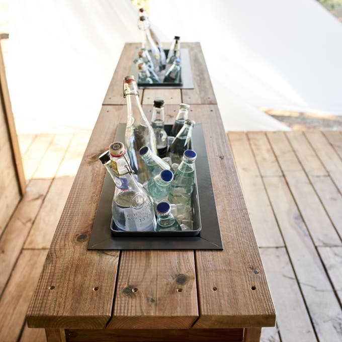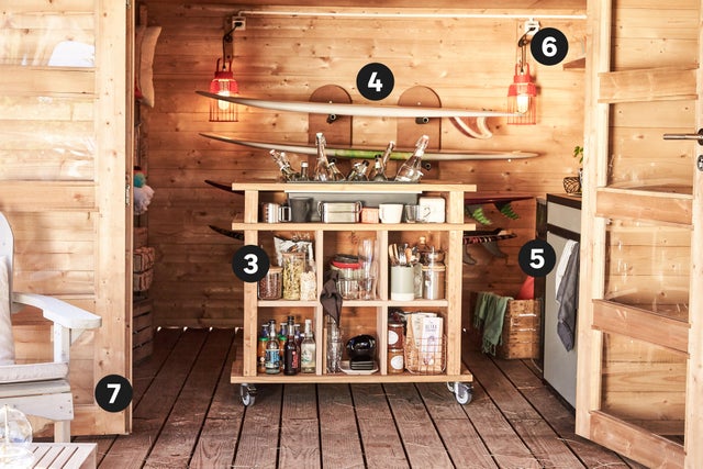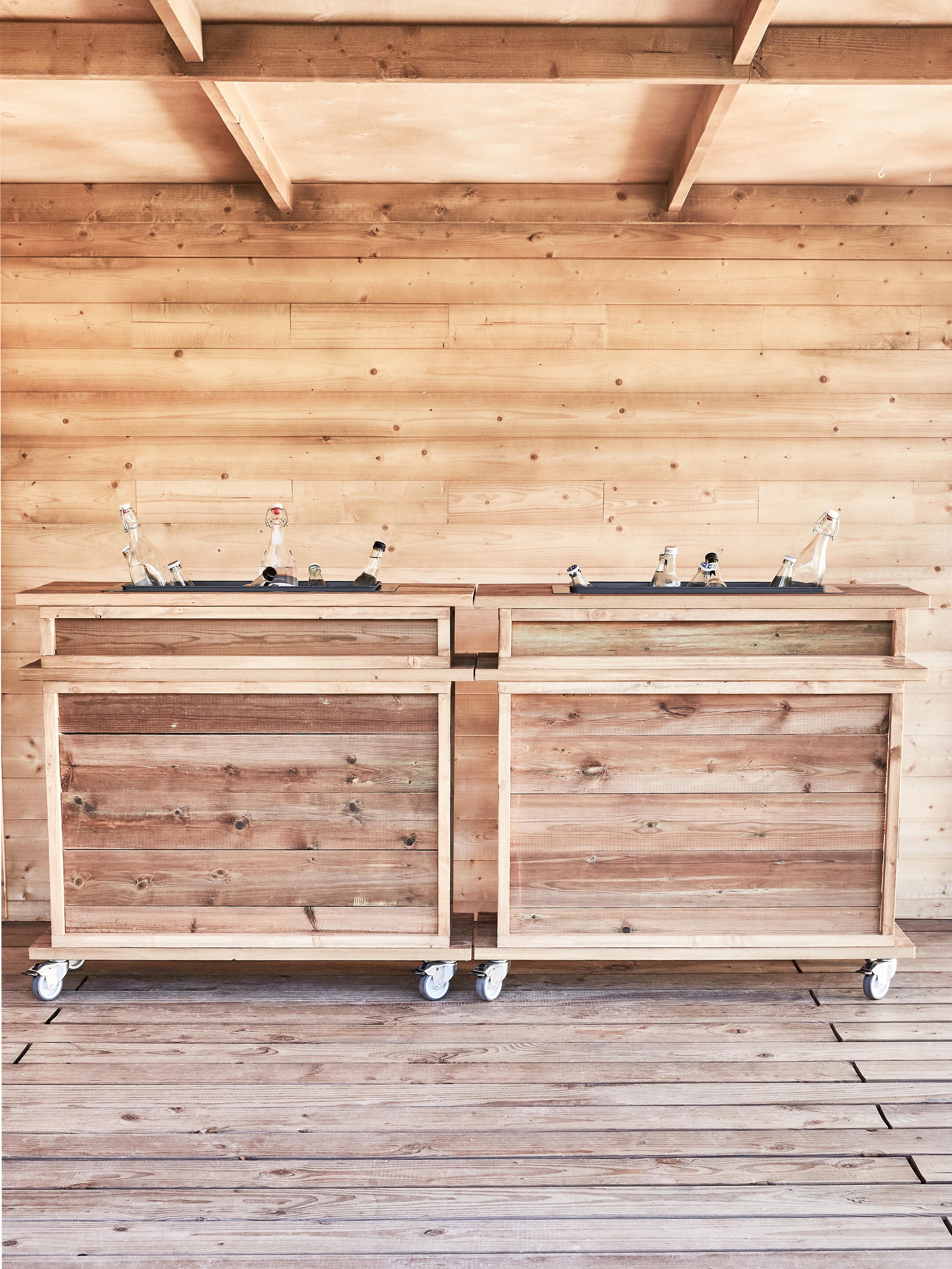 Le dos des modules comprend des étagères façon casiers, pratiques pour la vaisselle et les accessoires. Des roulettes permettent de déplacer les deux éléments du bar à l’endroit souhaité et de les remiser dans l’abri hors saison.
