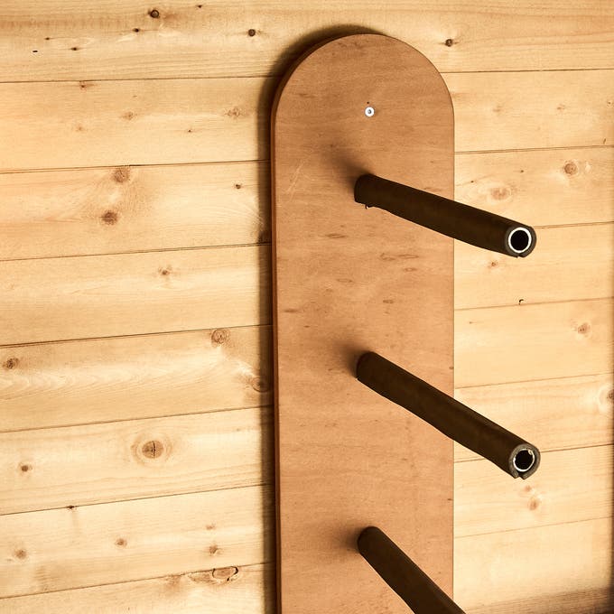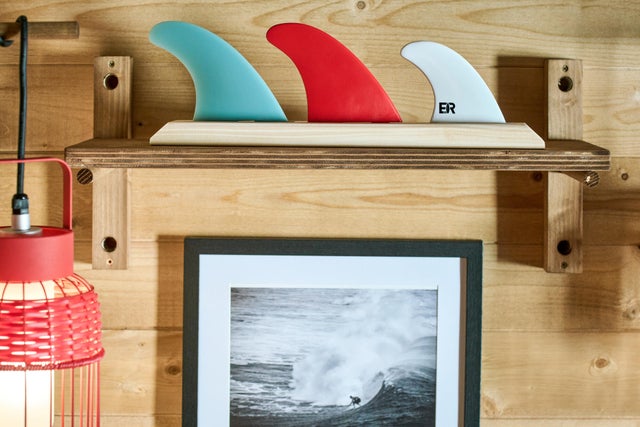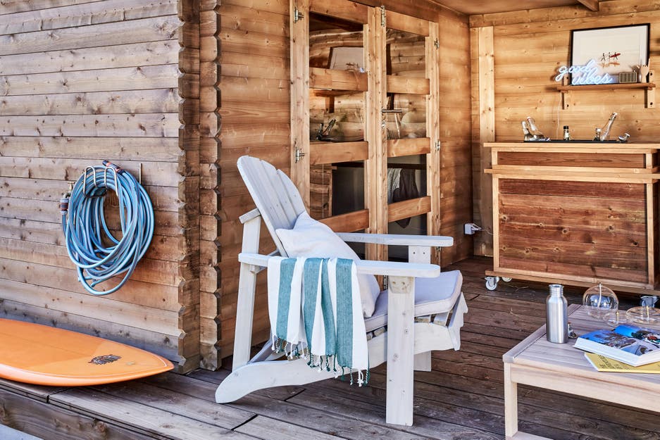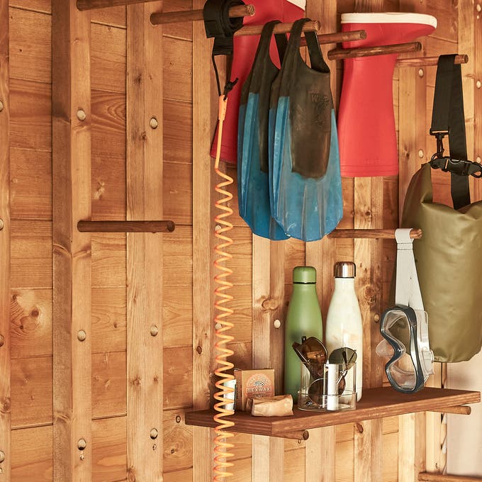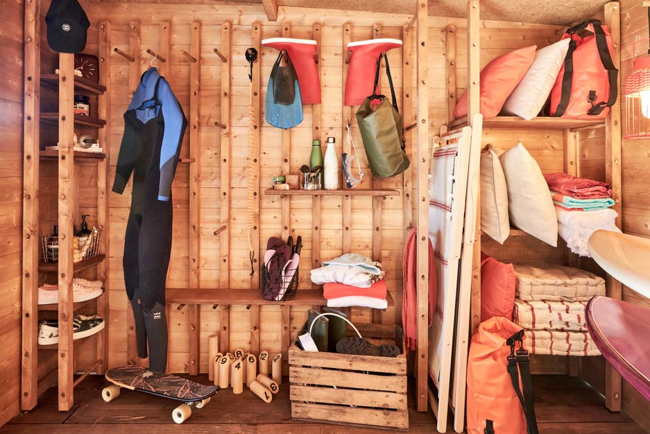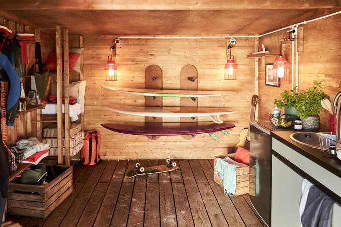 L’intérieur de l’abri est équipé de nombreux rangements sur mesure, pratiques en toute saison. Sur le mur du fond, on trouve un rack à surfs, réalisé à l’aide de lambourdes, de contreplaqué, de tubes en métal et de mousse de protection