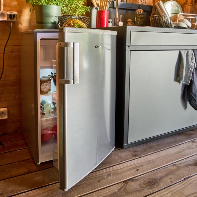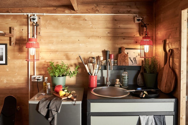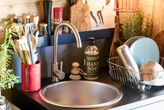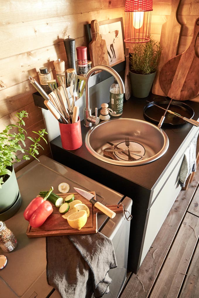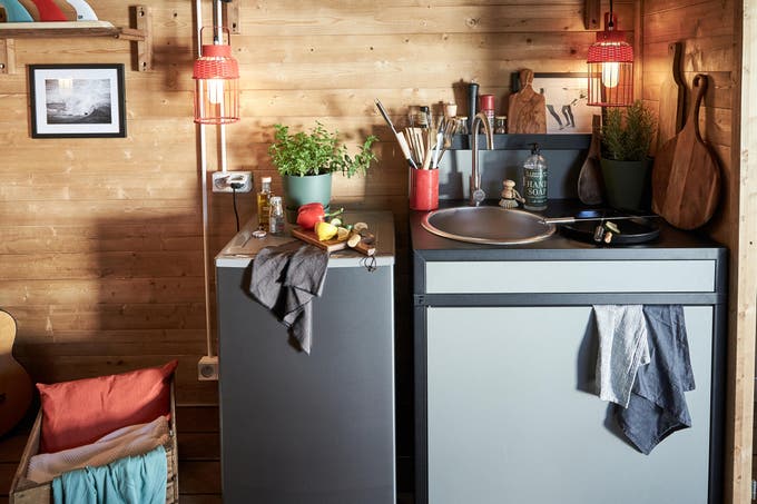 Le lavabo intégré dans le meuble permet de rincer la petite vaisselle ou les légumes et le dessus du frigo fait office de plan de travail.