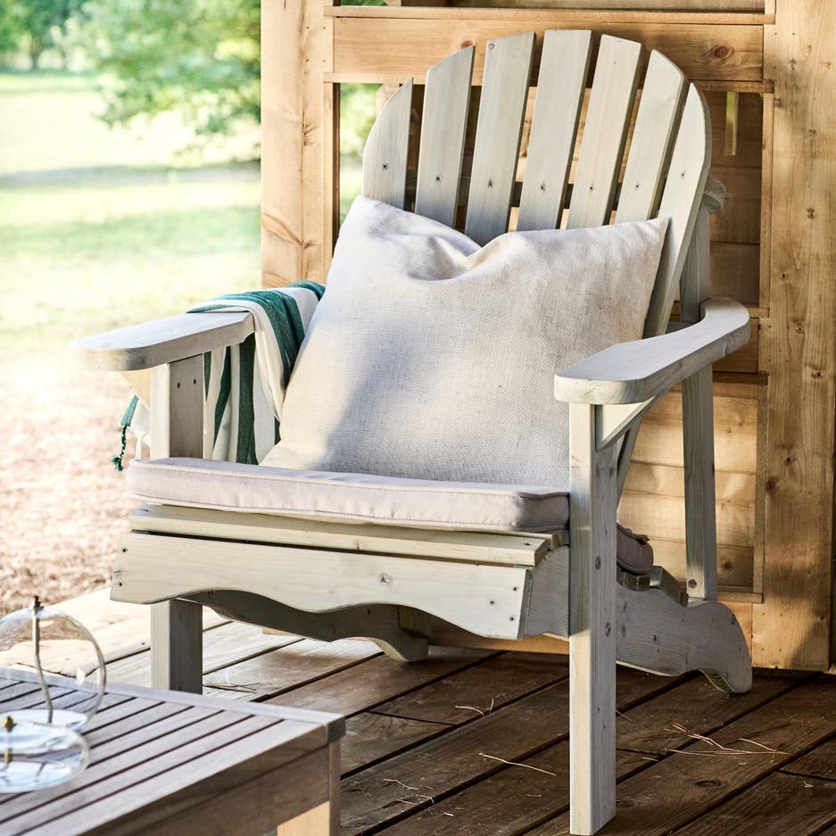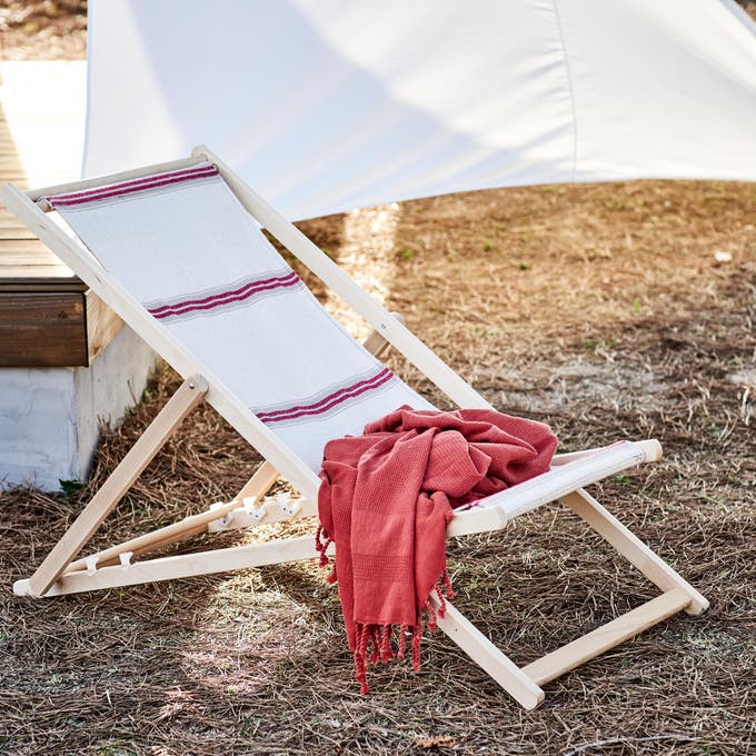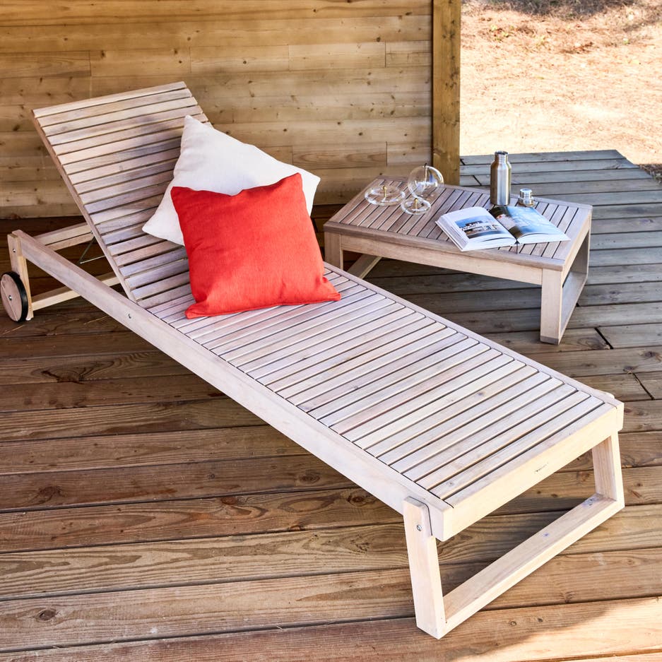Côté mobilier, on mise toujours sur le bois et l’esprit bord de mer. Fauteuils, transats, chiliennes ou bains de soleil sont choisis dans des tons de bois clair ou blanchis que l’on égaye en ajoutant quelques touches de rouge et d’orangé sous forme de coussins et de plaids.