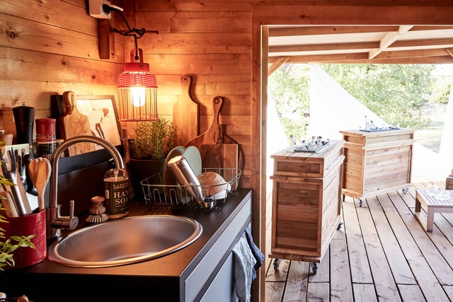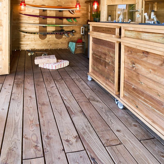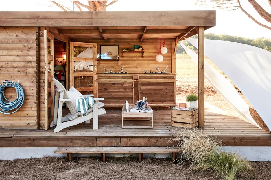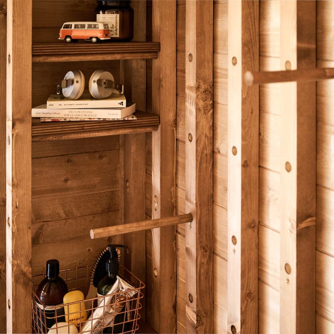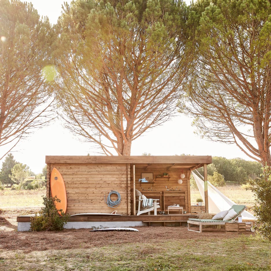 Dans cet espace au cœur de la nature, on privilégie les matières authentiques et la simplicité pour créer un univers intemporel, convivial et décontracté. Pour insuffler cette ambiance chaleureuse et sans prétention, on mise évidemment sur le bois pour l’abri de jardin, l’aménagement et le mobilier. Omniprésent, on le préfère en version brute, avec une lasure qui donne un effet « vieilli » aux parois de l’abri de jardin ou au sol recouvert de planches.