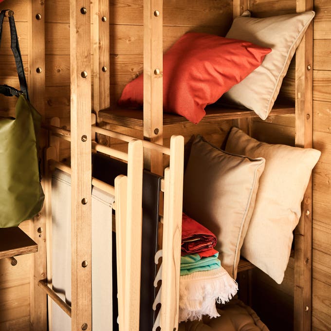On mixe tasseaux, tourillons et planches de bois pour créer des rangements modulables. Patères, étagères et même petit banc permettent de tout accrocher, suspendre ou poser.