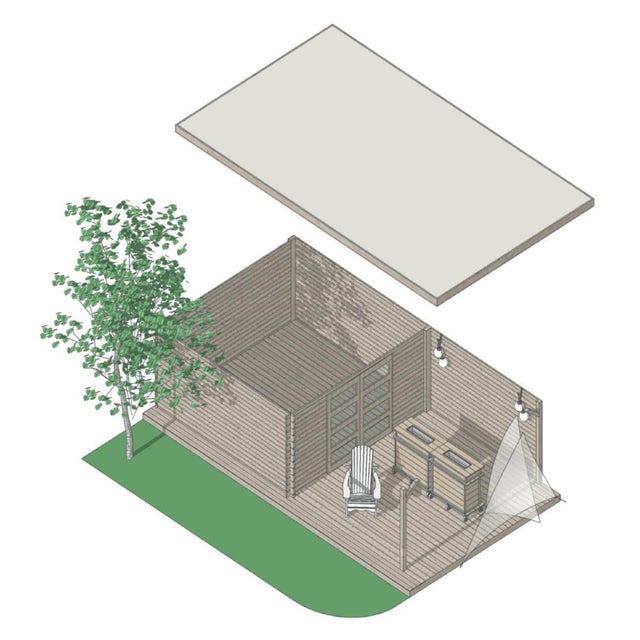 L'abri de jardin comporte un espace fermé et un espace semi-ouvert façon auvent.
