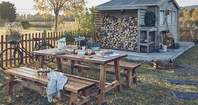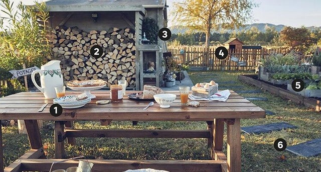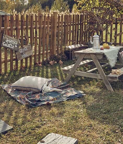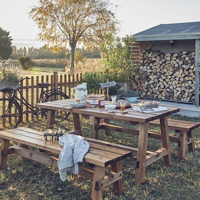 Chacun sa table et ses bancs façon aire de pique-nique, que l’on complète de coussins de sol et de plaids à disposer sur l’herbe. En fin de journée, on range le tout dans l’abri de jardin.