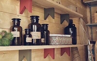 On complète avec des accessoires en bois et métal : étagère en forme de A, nichoirs, arrosoir, etc.