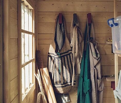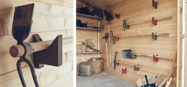 Le rangement des grands outils n’est plus un casse-tête avec cette solution gain de place, sécurisée et astucieuse : râteau, bêche et autres outils sont posés à l’horizontale sur des supports DIY (à découper dans une pièce de bois et à visser dans la paroi de l’abri).