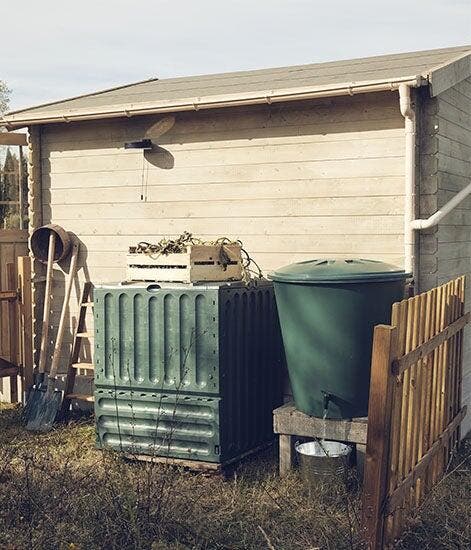 Indispensable lorsque l’on installe un potager, le composteur. On se sert de l’abri pour l’adosser et on le place du côté le moins visible.