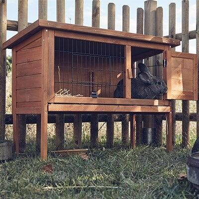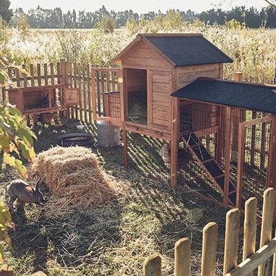 Pour offrir suffisamment d’espace aux animaux, on prévoit un enclos d’environ 10 m² dans lequel on installe un grand poulailler et un clapier.