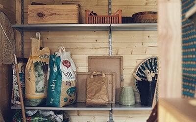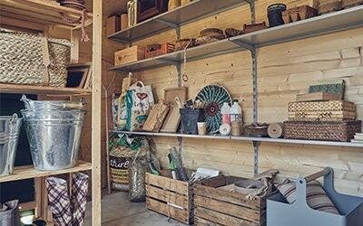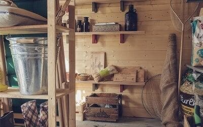 Pour optimiser le rangement, toutes les parois intérieures de l’abri sont exploitées. Sur l’un des côtés, on installe des étagères utilitaires grâce à un système de crémaillères, une habile façon de moduler la hauteur des tablettes et de l’adapter aux éléments à ranger.