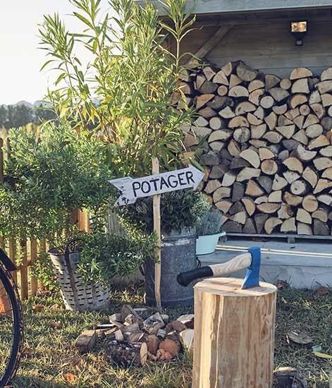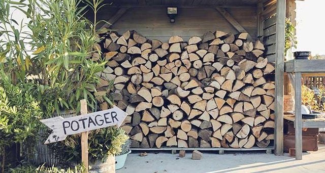 2. Un range-bûches adossé à l’abri de jardin où l’on stocke le bois de l’année.