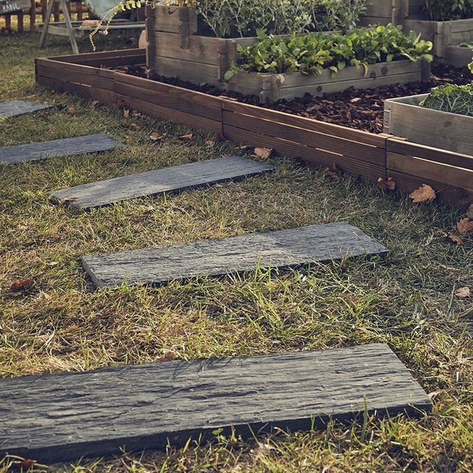 Dans ce jardin où l’on préserve l’environnement, on installe des traverses en ardoise en guise d’allée :