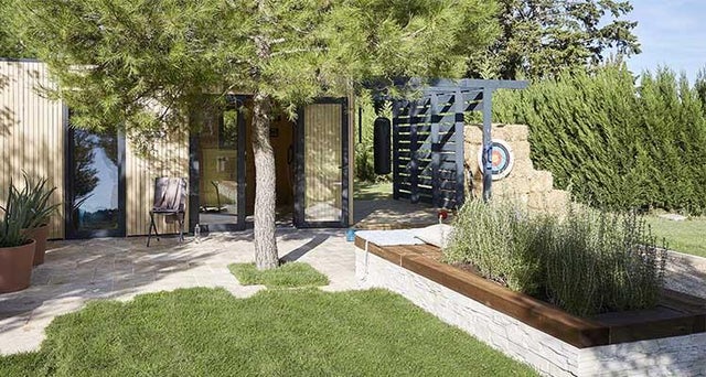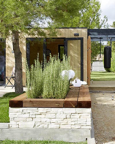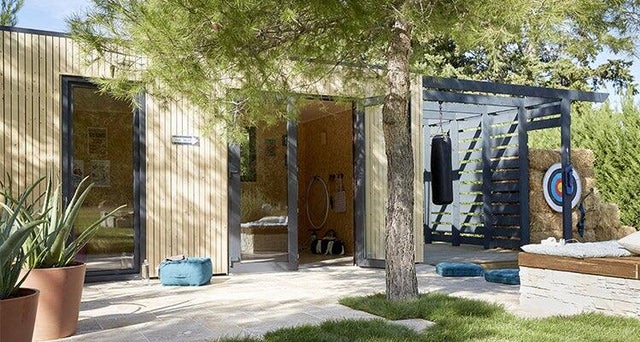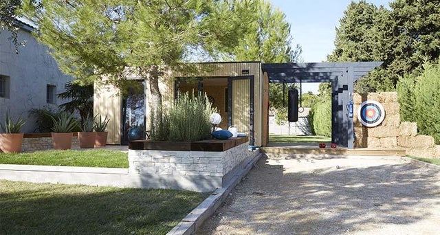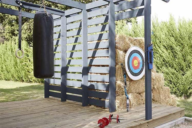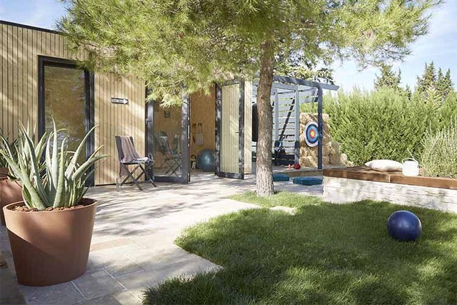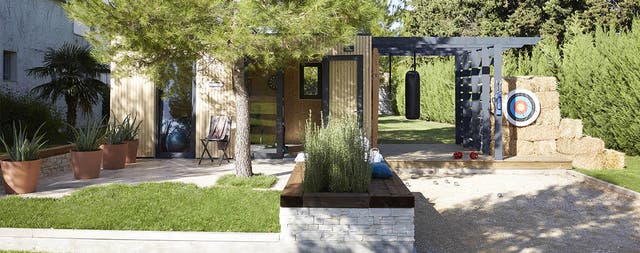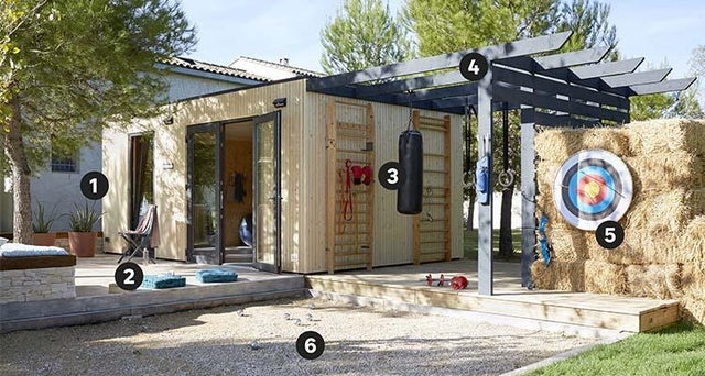 Pouvoir faire du sport dans de bonnes conditions et à n’importe quel moment… c’est possible ! La seule condition, c’est de disposer d’un bout de jardin et de l’aménager pour s’entraîner toute l’année. On se sert d’un studio de jardin d’une surface de 17m² pour créer le « cœur » des installations : prêt à monter, il s’aménage facilement et permet de pratiquer lorsqu’il fait froid ou qu’il pleut. On le complète en l’entourant de deux terrasses, d’une pergola avec espaliers et sac de frappe, d’un stand de tir à l’arc et d’un terrain de pétanque. Un jardin sportif qui fait le bonheur de toute la famille.