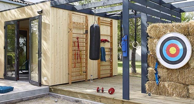 La façade du studio permet de fixer les espaliers, tandis que sac de frappe et anneaux sont suspendus à la structure de la pergola.