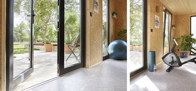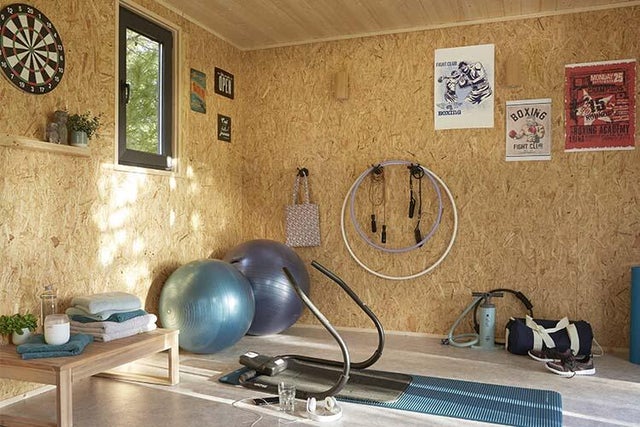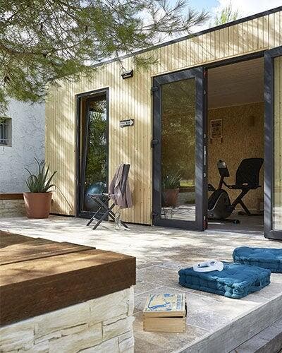 1. Un studio de jardin à structure bois, prêt-à-monter et transformé en salle de sport.