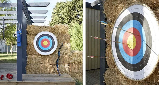 Le vrai plus : des bottes de foin empilées servent de support à une cible de tir à l’arc.