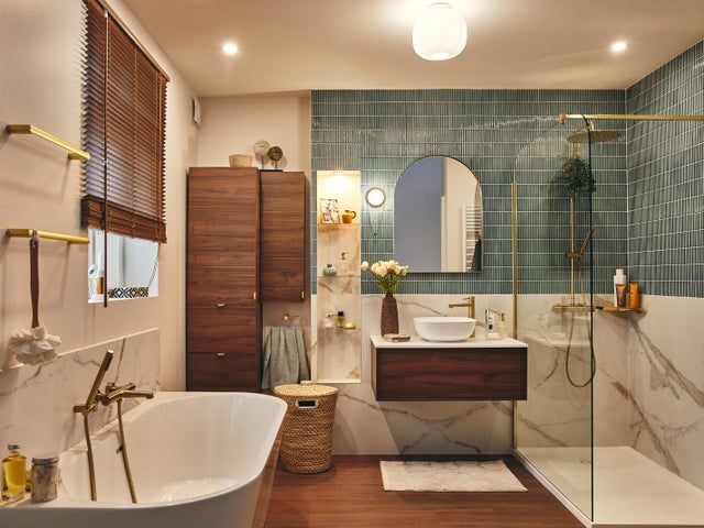 Pour que la salle de bains reprenne tous les codes d’une suite d’hôtel, on ne renonce à rien : on veut une belle baignoire semi-îlot et une grande douche à l’italienne.