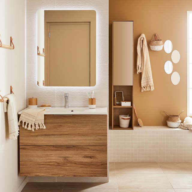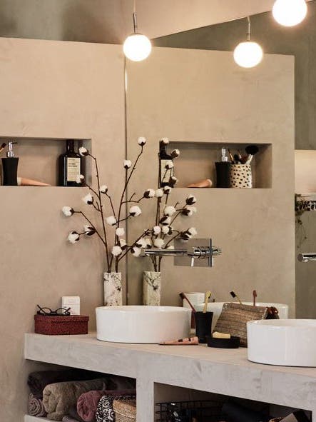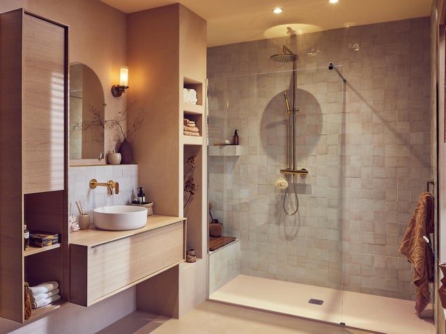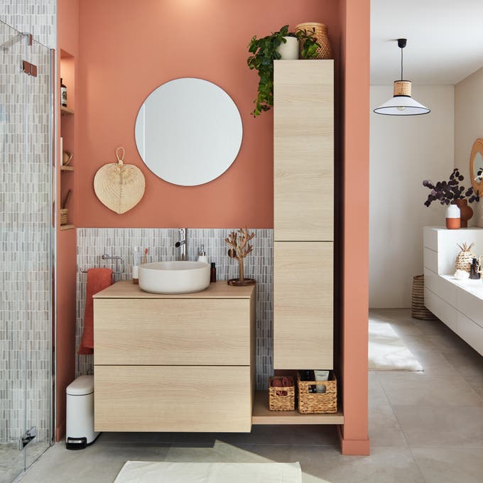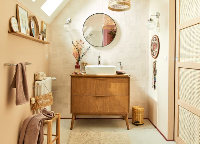 Pour une salle de bains bohème : on explore la palette des couleurs chaudes comme le beige rosé, le camel ou le terracotta.