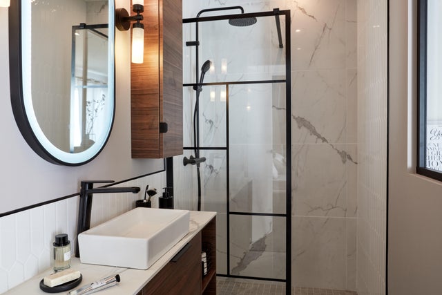 Des contrastes de noir et blanc. Le noir et blanc est toujours efficace dans une pièce fonctionnelle comme la salle de bains. Le contraste donne de la personnalité et on est certains de ne pas se lasser.