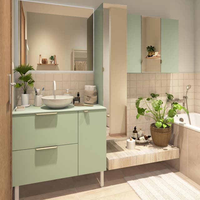 Au moment de choisir la couleur pour votre salle de bains, mieux vaut vérifier que votre lumière rend bien les couleurs. Si vous avez une salle de bains baignée de lumière naturelle, pas de problème : le rendu des couleurs sera bon. Si en revanche, votre salle de bains ne possède pas de fenêtre, mieux vaut soigner l’éclairage pour profiter pleinement des couleurs que vous aimez. Choisissez des ampoules avec un rendu lumière du jour et un indice de rendu des couleurs (IRC) proche de 100. Ces informations figurent sur l’emballage de vos ampoules.