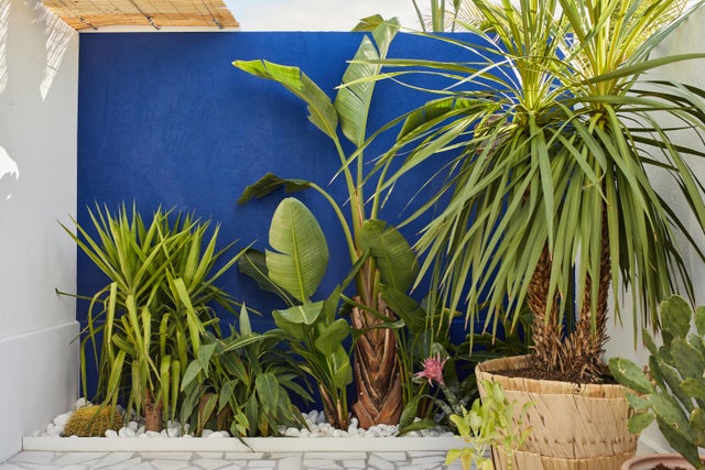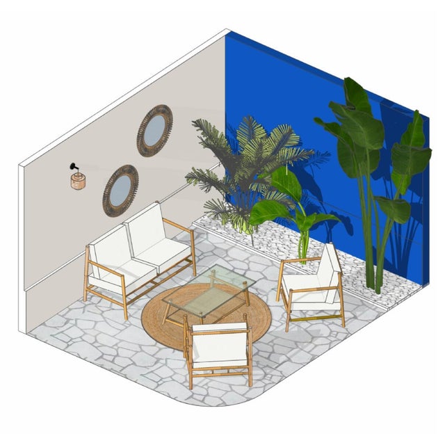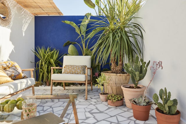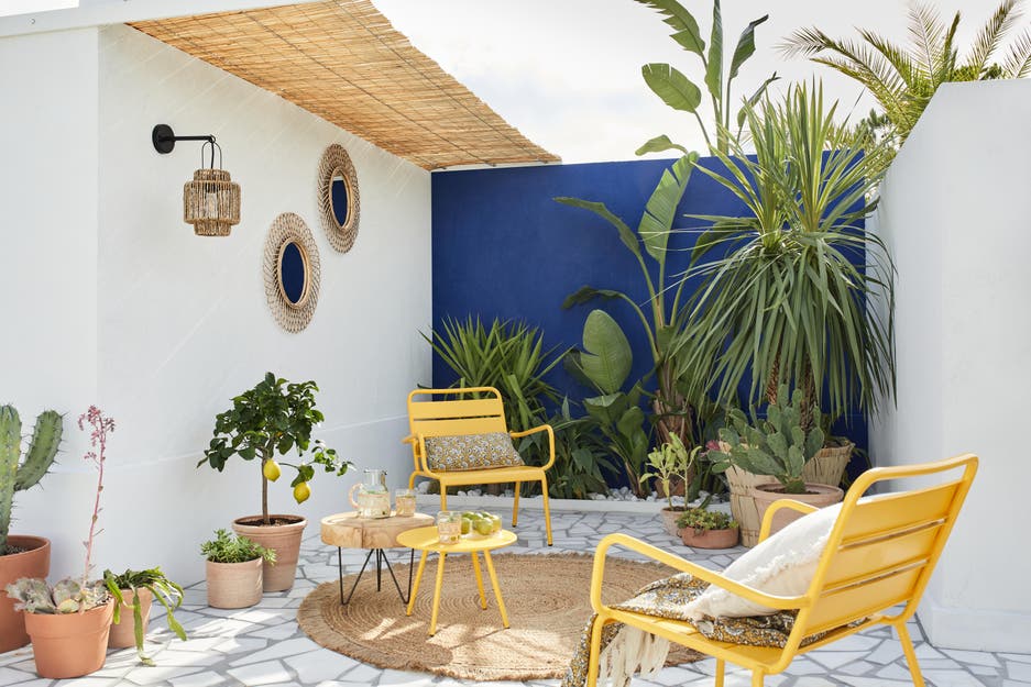 Mais que faire de ce recoin à côté de la maison ? Et si vous l’aménagiez en espace détente, beau, agréable et stylé ? Pour cela, on ose la couleur, idéale pour structurer et donner du caractère. On mise sur un bleu intense posé en aplat et entouré de blanc qui apporte lumière et effet de contraste. On ajoute un maximum de plantes exotiques façon jardin tropical et, pour créer une ambiance déco chaleureuse, on abuse des fibres naturelles, de leurs tons miel et de leur rusticité. Du mobilier confortable, quelques touches de jaune et des luminaires finalisent la personnalisation du lieu. Découvrez comment vous en inspirer.