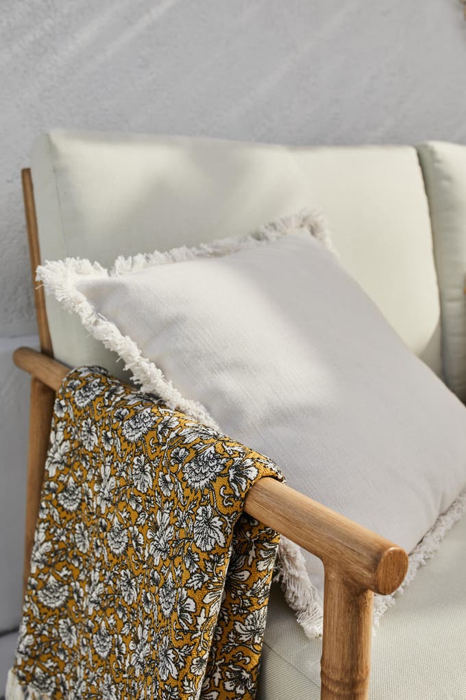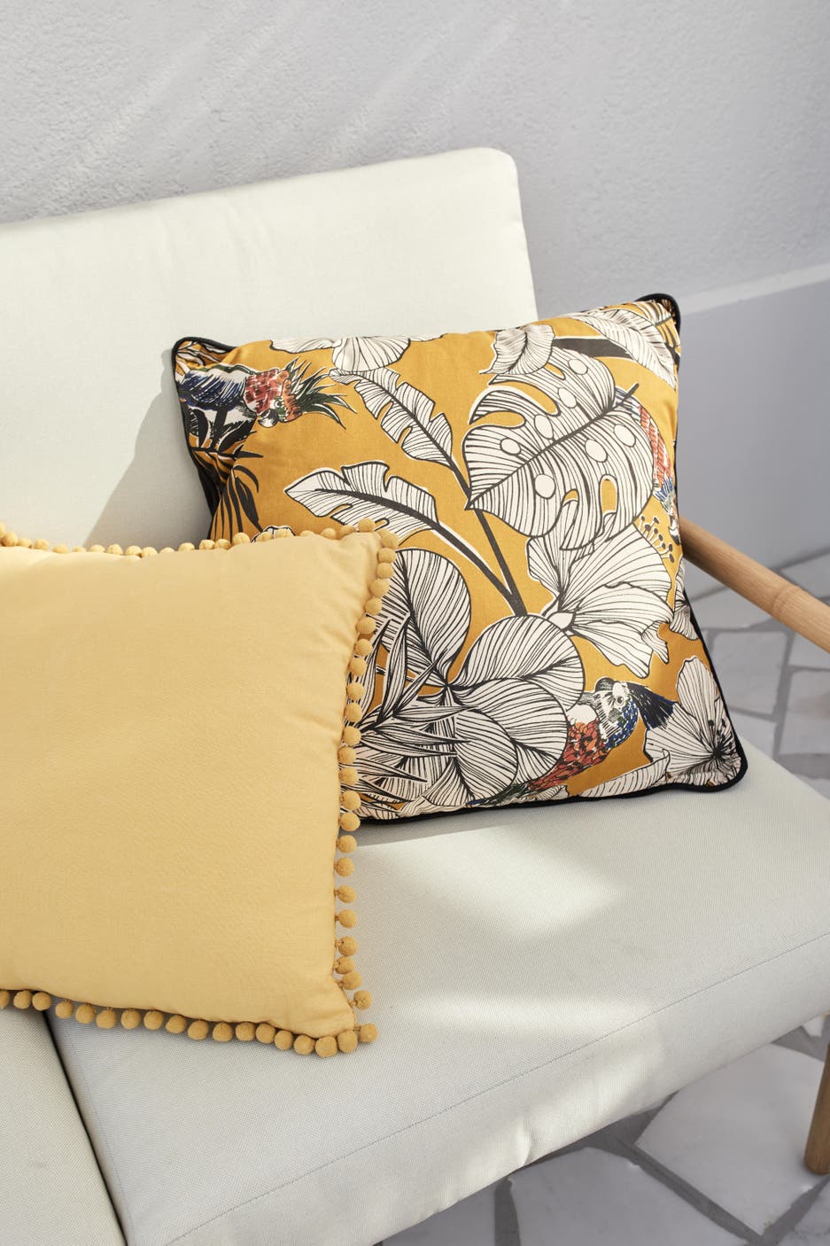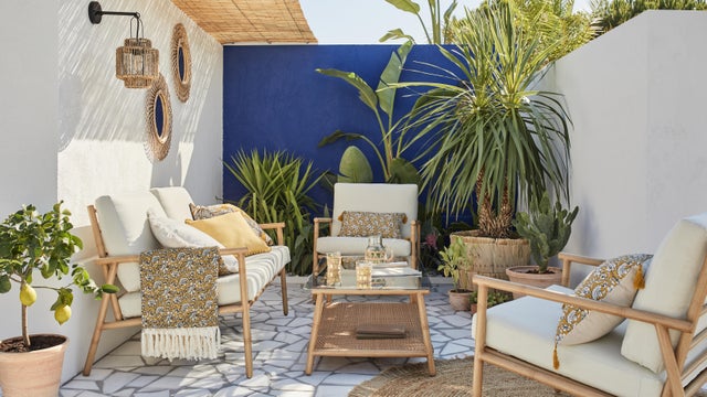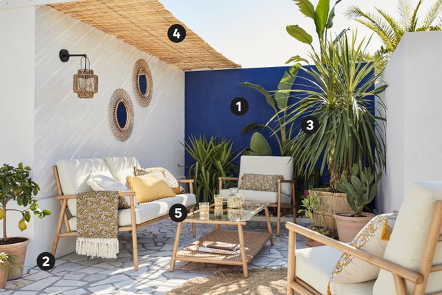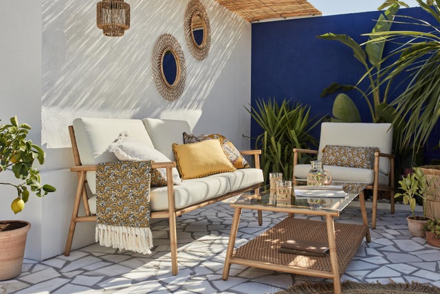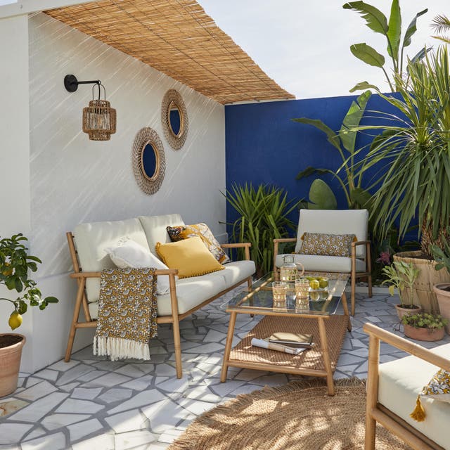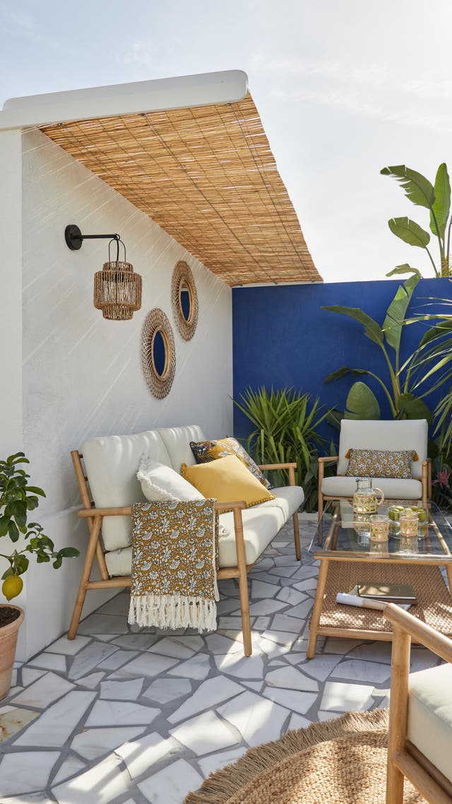 Côté mobilier et textiles, on mixe effet bois et blanc pour le salon de jardin ultra-confortable et les touches de jaune.