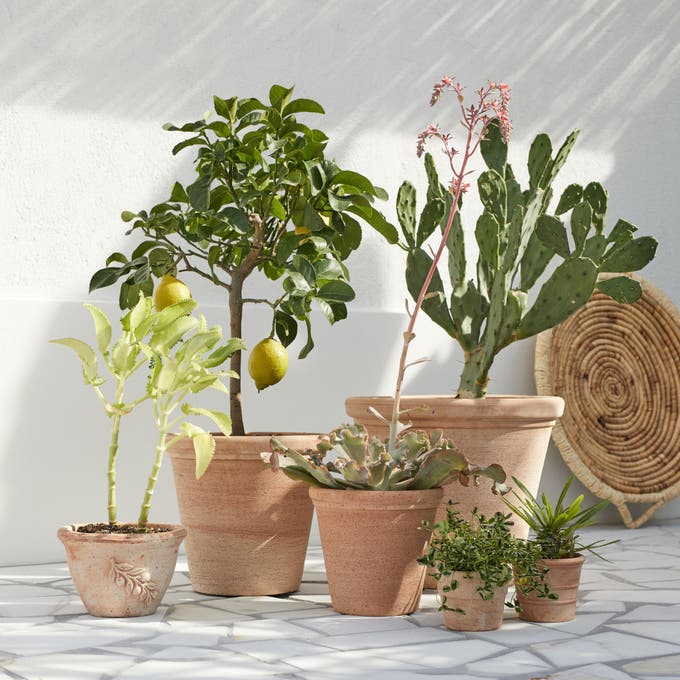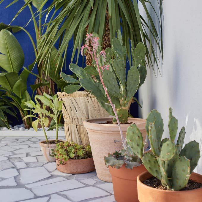 En plus des plantes installées dans la plate-bande, on multiplie les végétaux en pots. Cactus, palmiers, citronniers et plantes grasses renforcent le caractère exotique de l’ambiance. On choisit de la terre cuite pour les pots aux formes et aux tailles variées, complétés par des cache-pots en fibres naturelles.