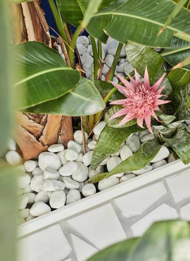 On recouvre la terre de galets blancs pour préserver l’humidité et ajouter un effet matière.
