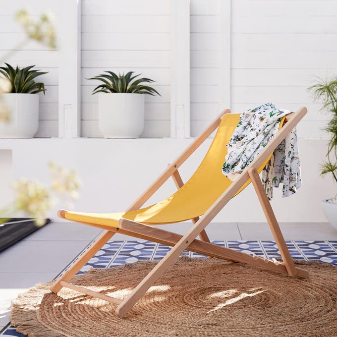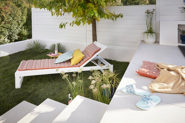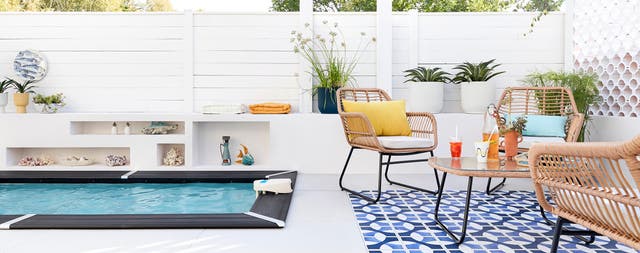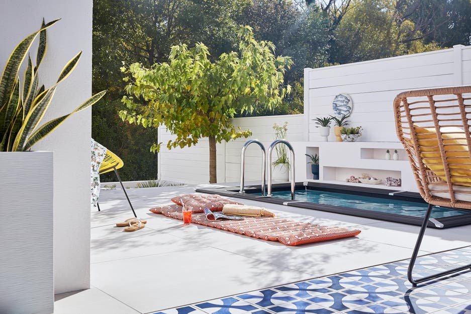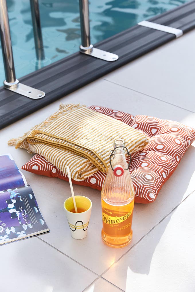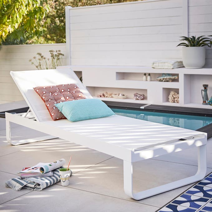 Aux abords du bassin, la terrasse devient solarium, avec matelas de sol ou fauteuils de jardin.