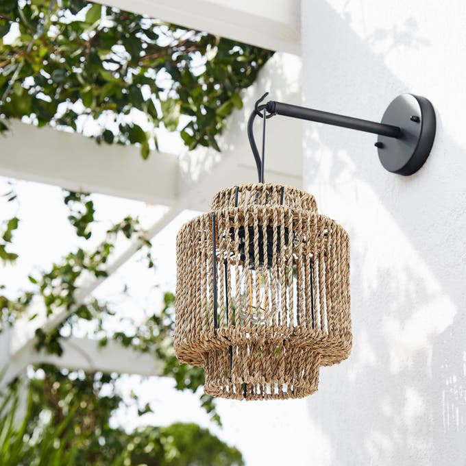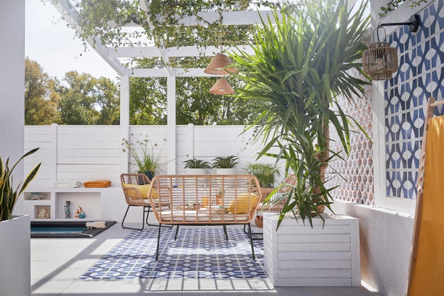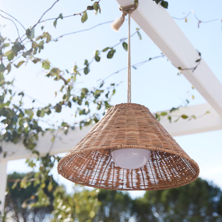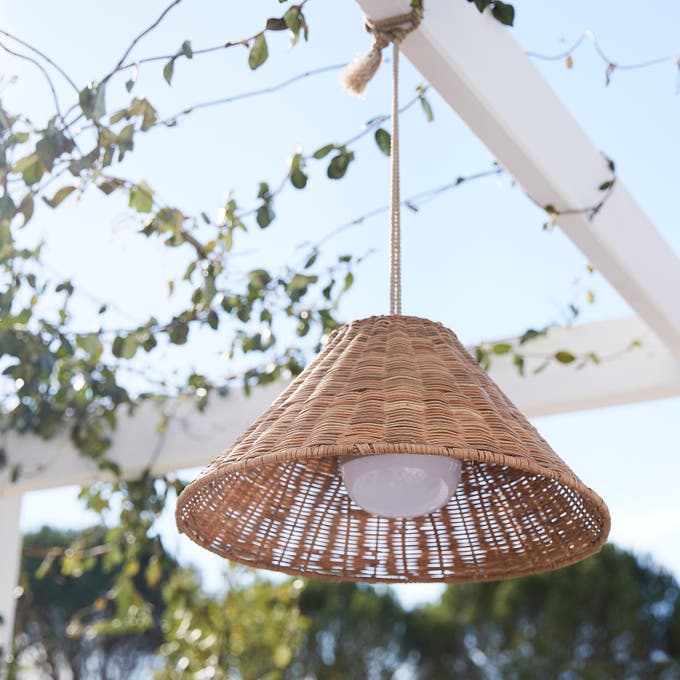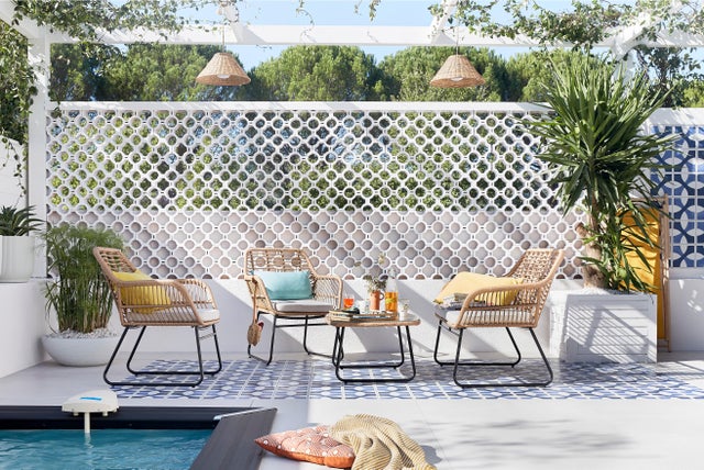 Pour le mobilier, on mixe bain de soleil design, en aluminium gris clair, et salon de jardin au look bohème, en acier façon rotin. Dans le même esprit, les luminaires sont assortis, avec leurs formes légères et leurs fibres naturelles.