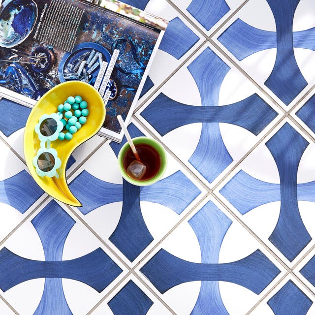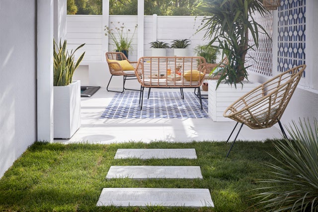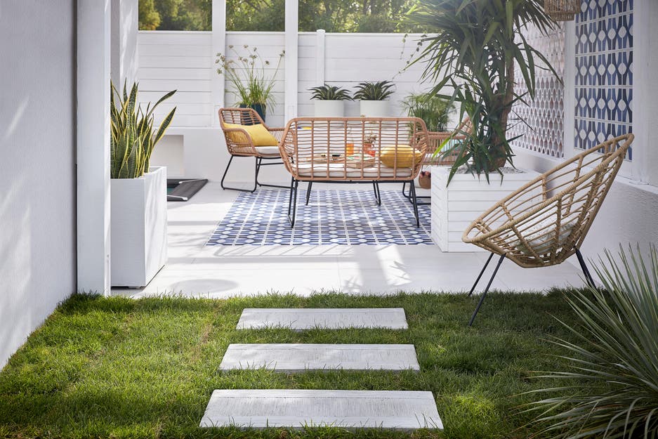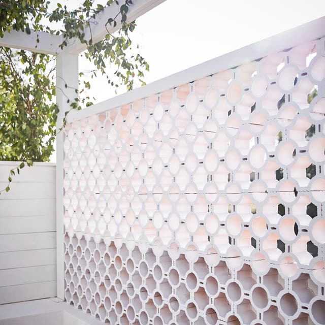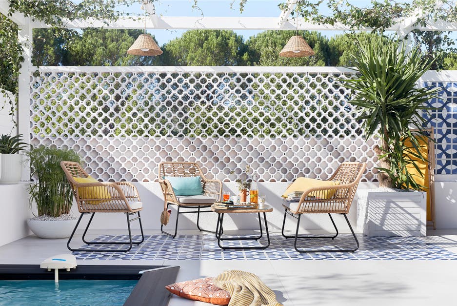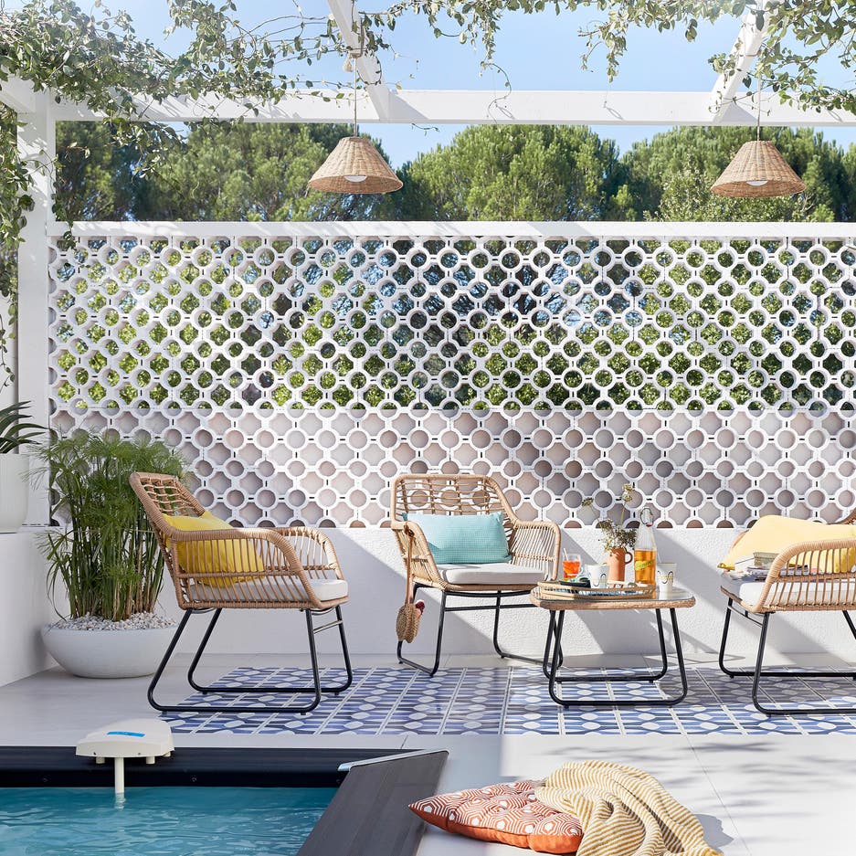 On ajoute du caractère et de la gaîté avec de jolies touches colorées et des jeux de texture et de graphisme, notamment au sol. On associe de grandes dalles effet béton blanc et un tapis de carreaux à motifs qui marquent le coin salon. Pour animer les surfaces claires et faire écho au tapis, on crée un décor mural assorti. Les claustras au look vintage donnent du relief au mur. Peints en blanc, ils s’harmonisent avec la teinte du béton et des maçonneries.