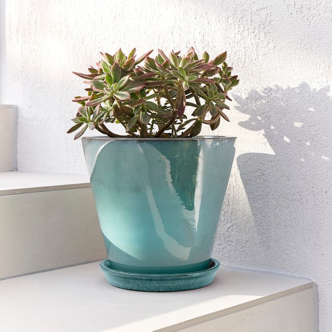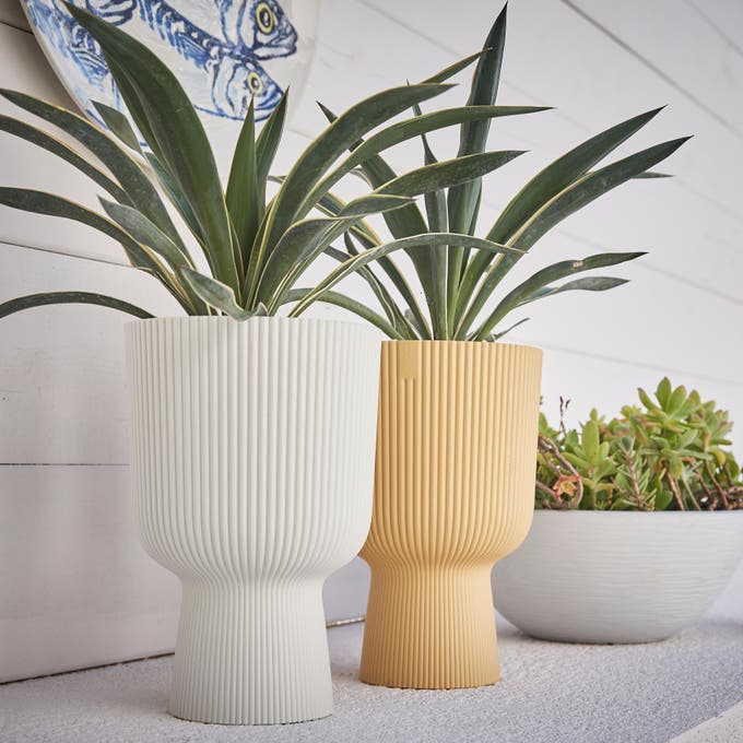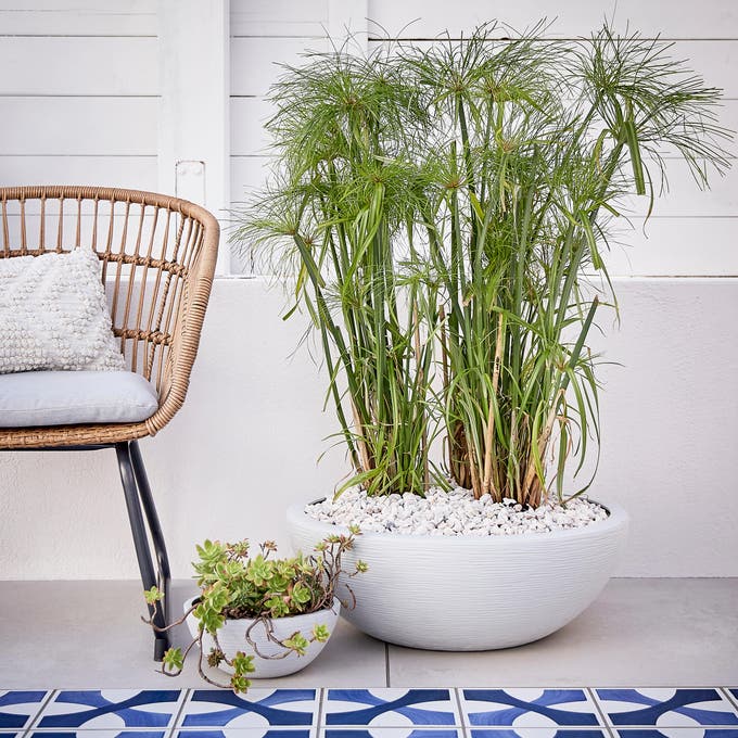 On renforce la présence du végétal en multipliant les plantes graphiques placées dans des pots que l’on choisit unis et dans des coloris assortis aux autres accessoires : du blanc, du jaune et différents tons de bleu. Et pour ajouter du graphisme, on joue avec les différentes formes, les textures et l’aspect, mat ou brillant.