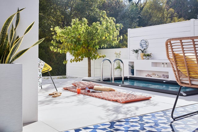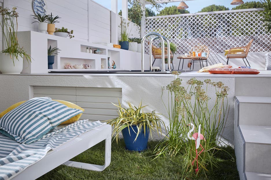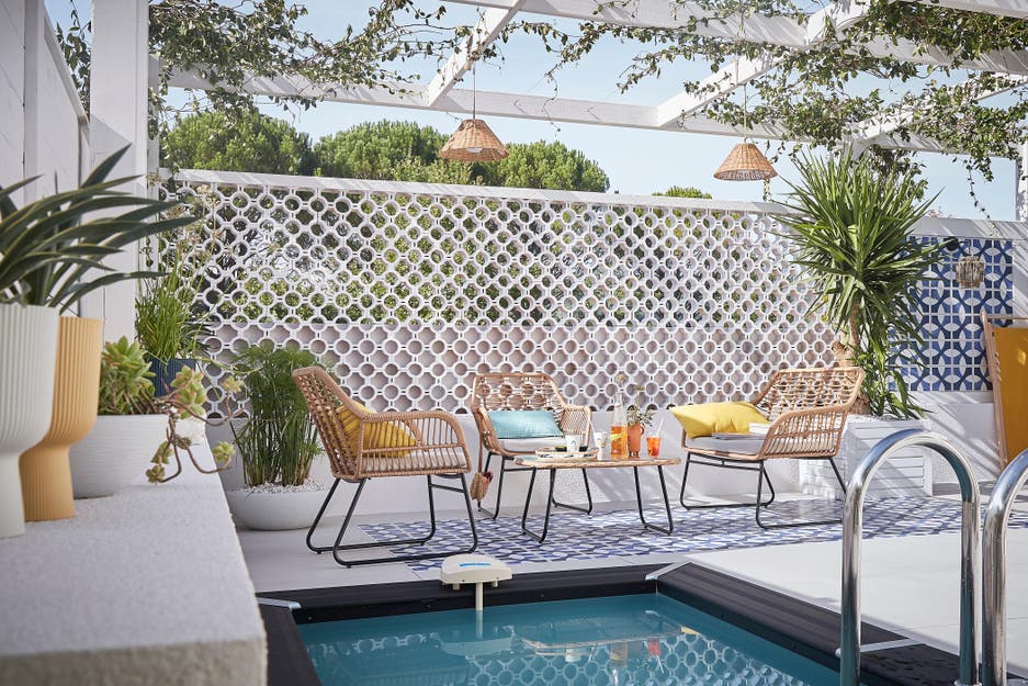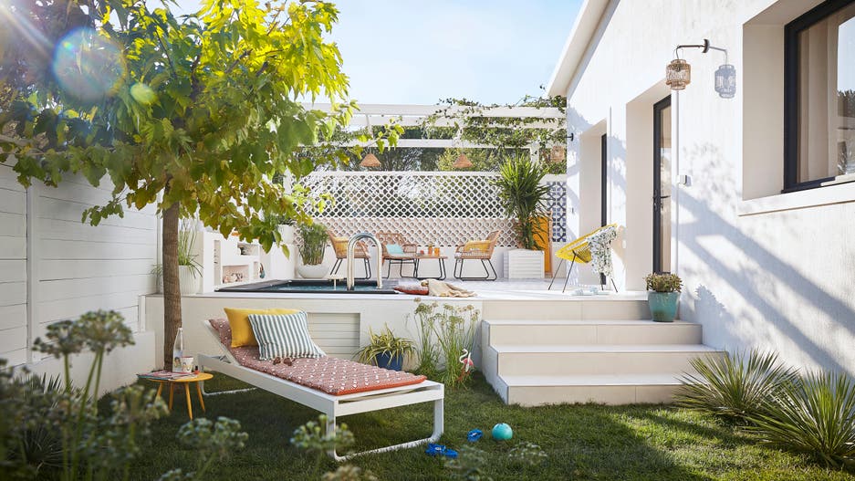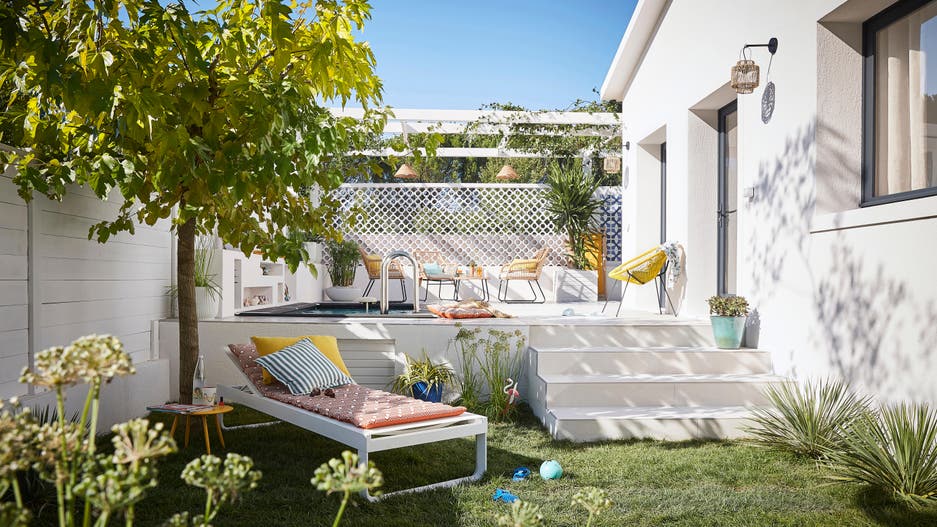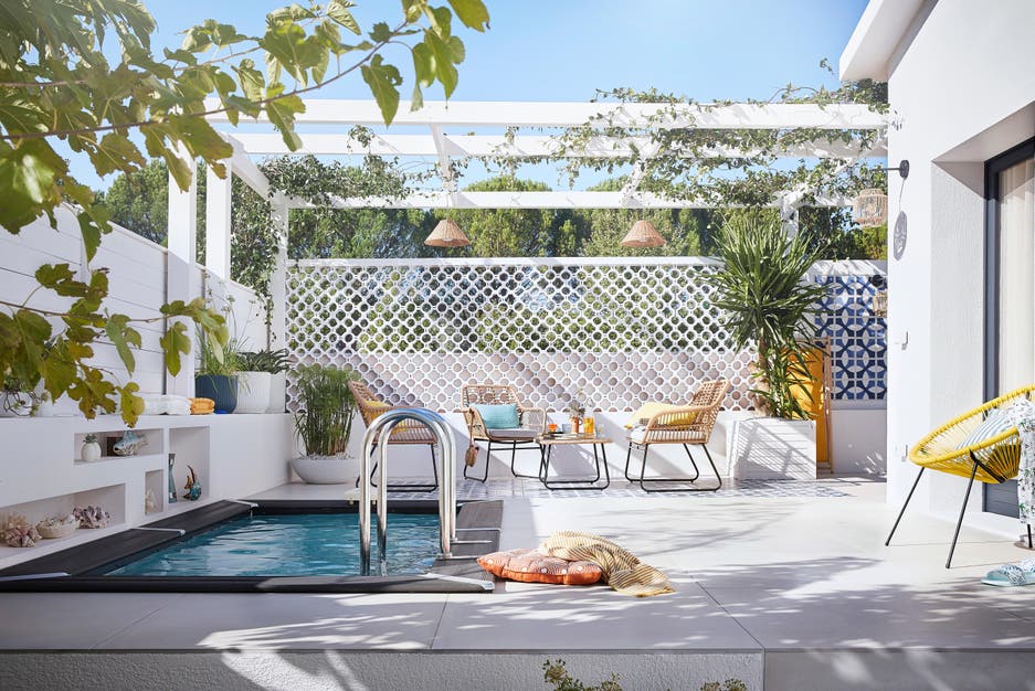 Qui a dit qu’il fallait un grand espace pour profiter d’une piscine ? Voici un aménagement qui prouve le contraire, avec un bassin hors-sol parfaitement intégré, complété par un salon d’extérieur. L’idée qui change tout ? Dissimuler la structure de la piscine dans une terrasse surélevée de plain-pied avec la maison. Le jardin se transforme en une bulle de bien-être avec une pergola sur mesure faisant office de brise-soleil, des clôtures aussi jolies que pratiques et des espaces détente pour se poser. Côté style, on mise sur un juste équilibre entre minéral et végétal, et sur une abondance de blanc pour créer une ambiance lumineuse et attrayante. Des fibres naturelles et quelques touches colorées en plus apportent ce qu’il faut de gaîté et de chaleur. Découvrez comment vous en inspirer.