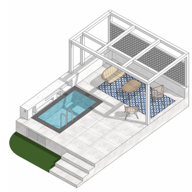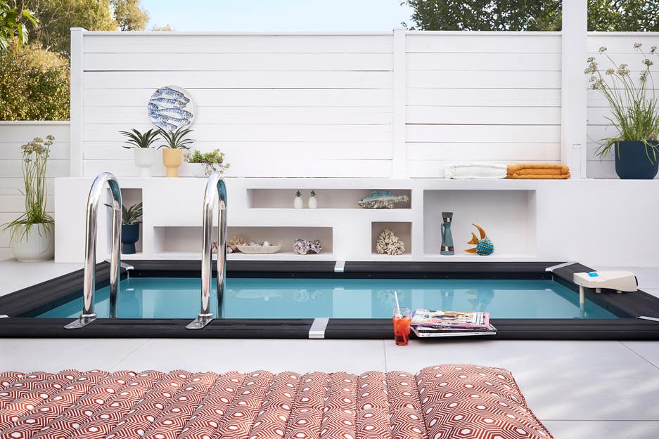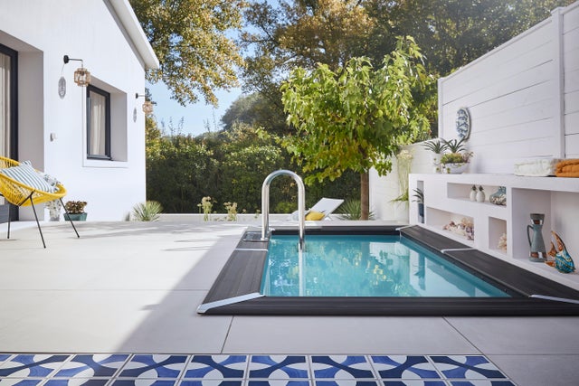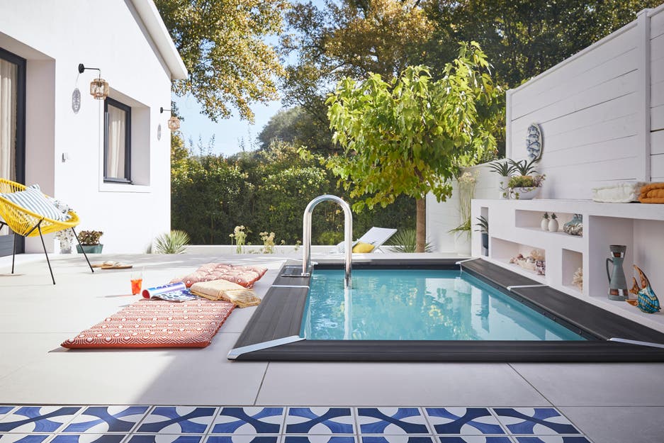 Dans le jardinet, on installe une piscine hors-sol de 3,26 sur 1,86 mètres. Sa structure disparaît totalement dans la terrasse aménagée, ne laissant voir que la surface de l’eau.