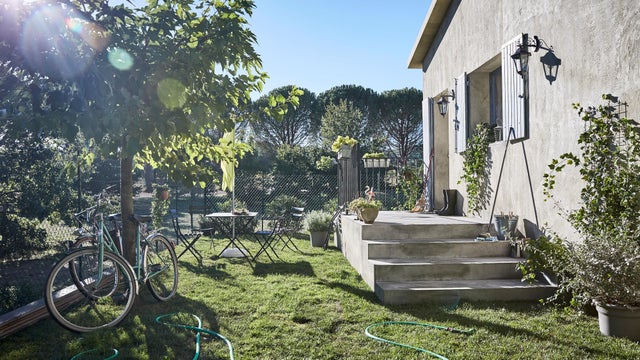 En contrebas, le jardinet est engazonné et transformé en coin détente.