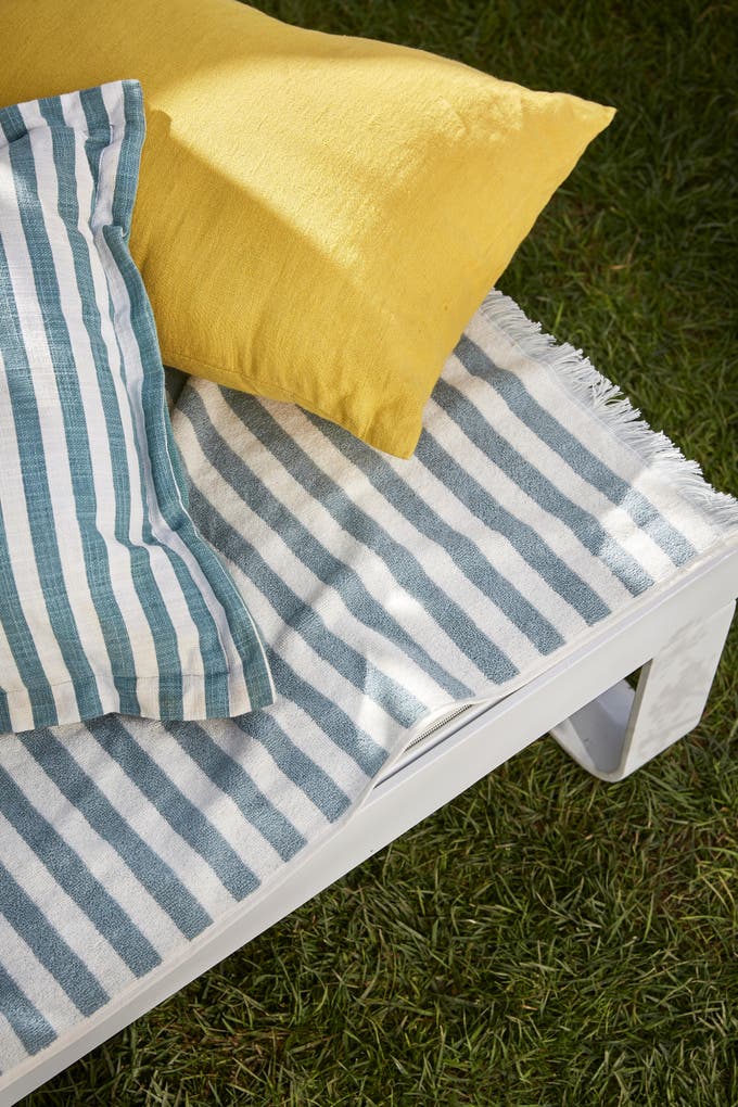Côté textiles et accessoires, on s’inspire de l’univers coloré et ludique des années 60 : des motifs, des rayures, du jaune, de l’orangé et différentes nuances de bleu qui évoquent le soleil et l’eau.